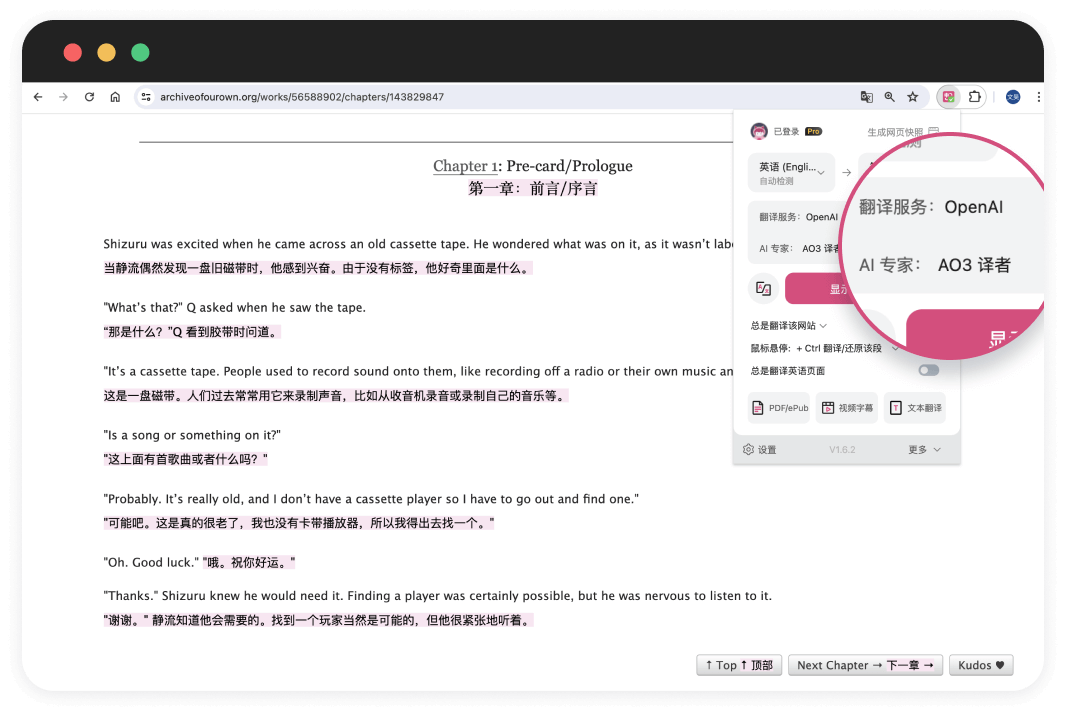 针对 AO3 社区的独特需求,我们开发了一款创新的 AO3 AI 翻译专家。你可以在沉浸式翻译支持的 AI 类翻译服务(如 OpenAI、Claude、Gemini)中使用它,我们致力于为 AO3 爱好者提供更加精准、流畅的阅读体检。